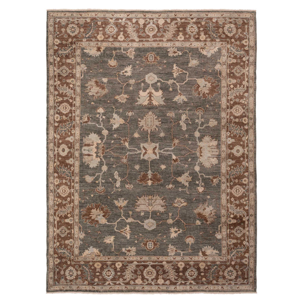 The Brown Traditional Oushak Wool Rug, measuring 8'10" x 11'8", is a hand-knotted piece crafted in Turkey. This large area rug offers a classic aesthetic suitable for various home interiors. Constructed from 100% wool, this rug provides a durable and soft surface. The natural fibers offer resilience and inherent stain resistance, ensuring longevity. Its hand-knotted construction highlights the intricate details of the traditional Oushak design, a hallmark of Turkish craftsmanship. The rug features a central field in a sophisticated charcoal...