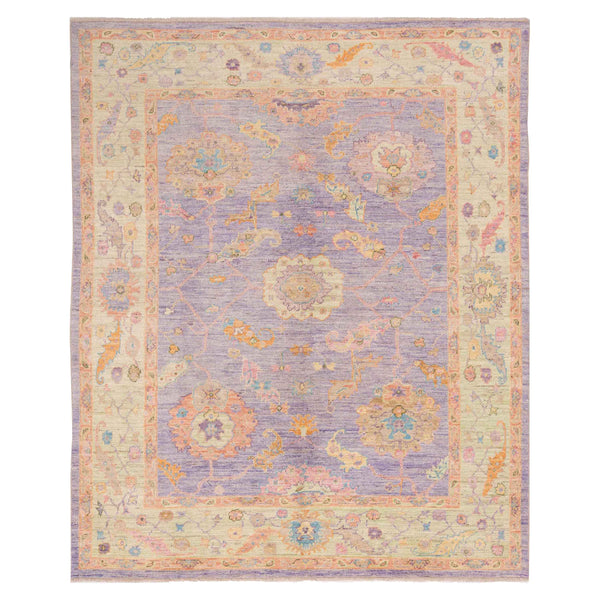 This Purple Traditional Oushak Wool Rug from Turkey features a soft lavender center with floral motifs and vine-like designs in pastel shades. Hand-knotted from high-quality wool, this 8'3" x 9'6" rug boasts intricate patterns and a cream-colored border for a beautiful and traditional look.
