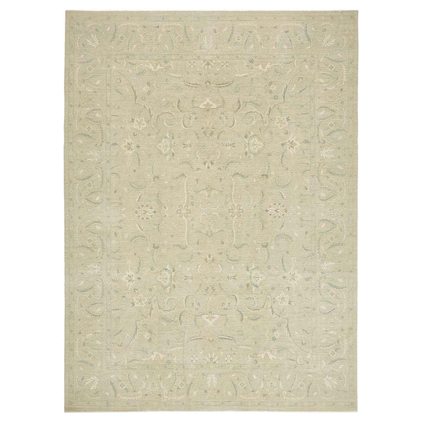 The hand-knotted wool rug unveils a luxurious blend of tradition and subtle sophistication, weaving its craftsmanship through every fiber. With its expansive dimensions of 8'11" by 12'3", it defines space with authority but without arrogance—whether draped across a living room, nestled in a dining area, or grounding the expanse of a master bedroom. Its color whispers rather than shouts—light sage or that enigmatic greige—infusing rooms with a quiet elegance that dances seamlessly through various decors. The muted tones serve as...
