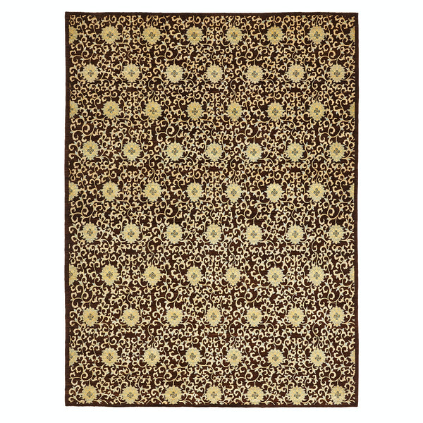 A hand-knotted marvel, this brown transitional wool rug, stretching nearly 10 feet wide by over 13 feet long, is not just a decorative item but a statement. At 59.0 pounds, its presence is felt even before its visuals capture the eye. This is more than a rug—it's a tapestry of motifs, where light-colored floral medallions, creamy beige or shimmering in pale gold, dance across a deep brown canvas. Swirling vines interlace these elements, creating movement that is both subtle and...