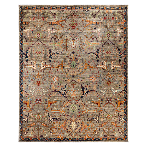 This Brown Traditional Serapi Wool Rug - 8' x 9'10" showcases a symmetrical pattern with floral and geometric motifs in shades of beige, orange, red, green, and blue. Hand-knotted in India, this high-end traditional rug exudes ornate elegance with its intricate design and quality wool texture.