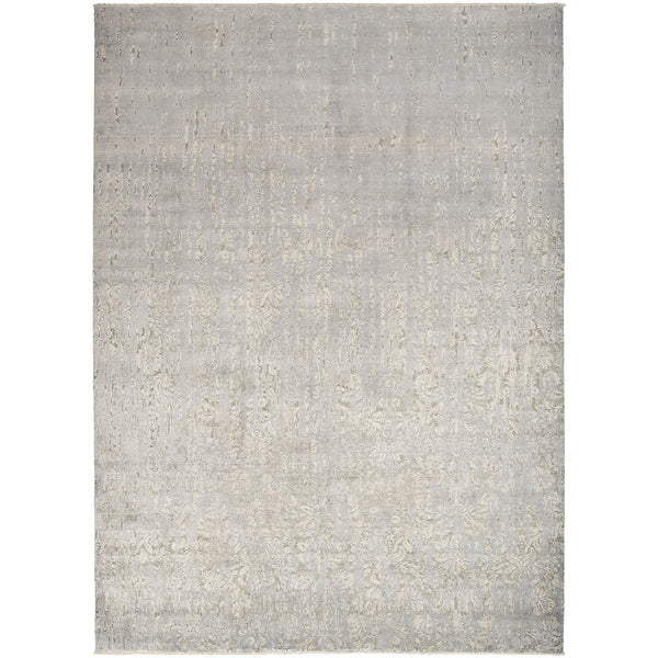 The Grey Modern Silk Rug - 9'11" x 13'5" from Pakistan features varying shades of grey with a soft, plush texture. Hand-knotted out of luxurious silk, this high-end piece boasts a monochromatic color scheme and an ornamental design. Add a touch of elegance to your space with this exquisite, quality rug.