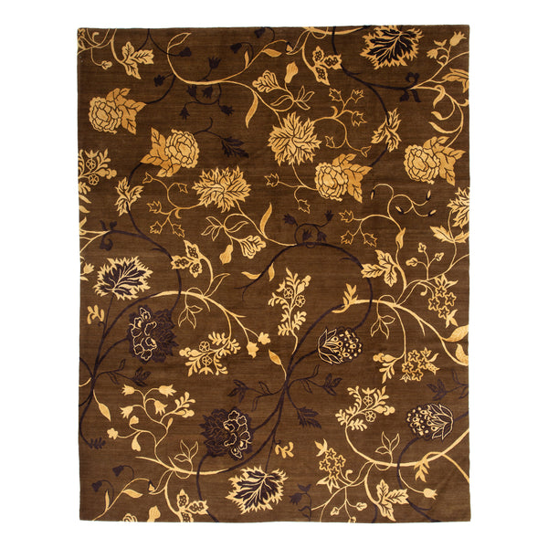 This traditional Tibetan rug presents a sophisticated floor covering, precisely measuring 9'1" x 11'10". It is crafted with a hand-knotted construction, a testament to skilled artistry from Nepal. The rug features a rich, solid brown background that provides a warm base. An intricate, all-over floral and vine pattern overlays this field, rendered in contrasting shades of light gold, tan, and subtle darker brown accents. These botanical motifs spread organically across the rug's surface, creating a detailed visual texture in keeping...
