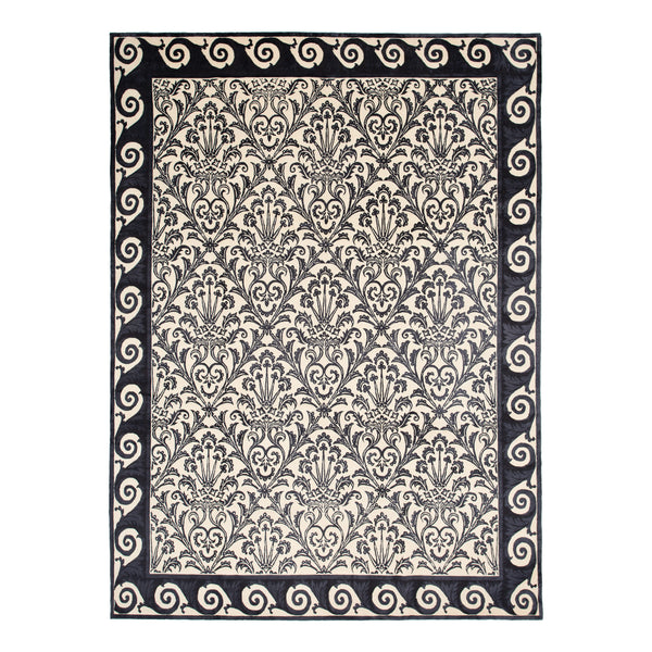 Add a touch of elegance to your space with this Black Traditional Tibetan Wool Silk Blend Rug. Handcrafted in Nepal, this 9'1" x 12'3" rug features a stunning design of floral motifs on a light background with a dark border. The wool silk blend offers a luxurious texture and exceptional quality.