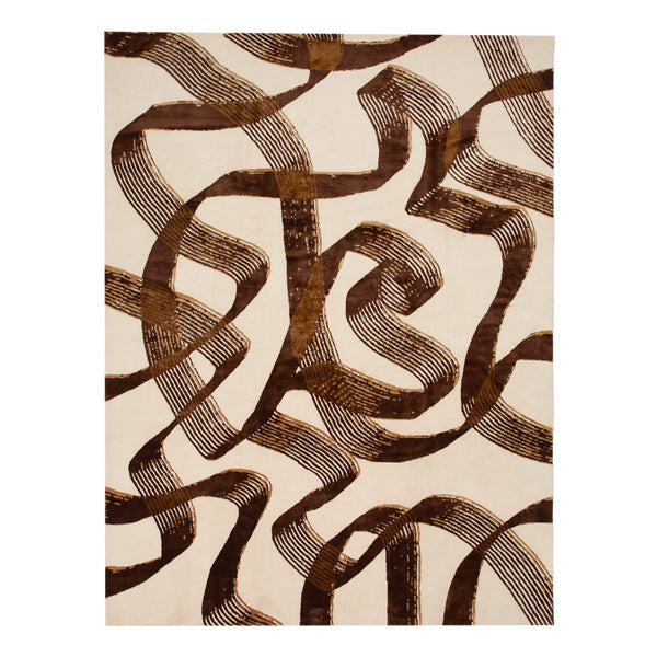 This contemporary area rug features an abstract design with a neutral color palette. Measuring 9'1" x 12', it provides substantial coverage for various living spaces. The design incorporates swirling brown, ribbon-like motifs set against a light, off-white background, creating visual movement. The abstract pattern consists of broad, curvilinear lines in varying shades and textures of brown. Some lines feature a solid appearance, while others present a subtle striped texture, adding depth and dimension. This design contributes to a dynamic visual...