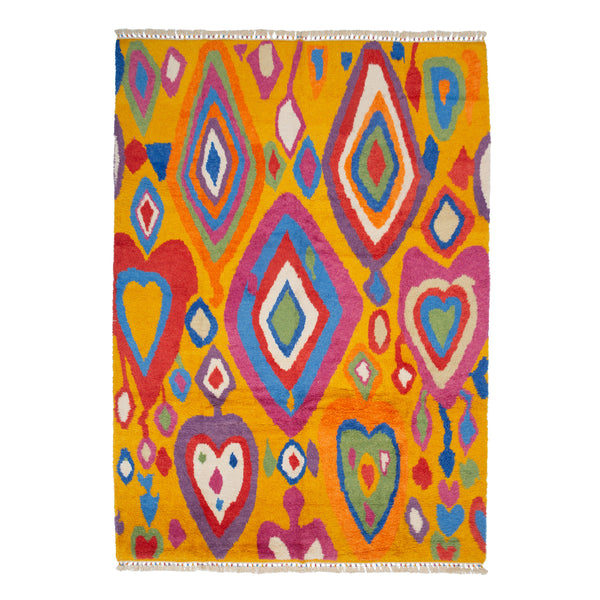 This Multicolored Carnaby Moroccan Style Wool Rug is a vibrant masterpiece from Turkey. Hand-knotted with intricate diamond and heart patterns in yellow, orange, pink, blue, and green, this 10'2" x 14'5" rug is a stunning display of quality craftsmanship and eye-catching design. Made of luxurious wool, this rug is sure to add a touch of elegance to any room.