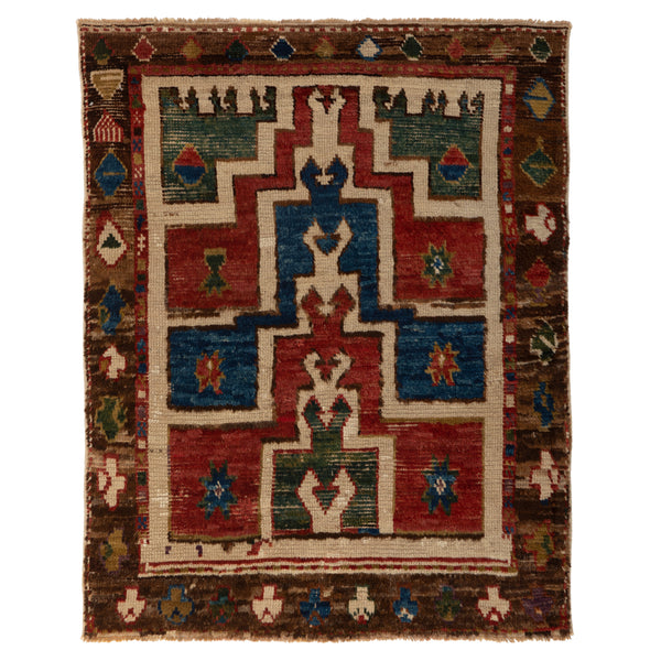 Embodying authentic craftsmanship, this hand-knotted Turkish wool rug melds tradition with timeless design. With dimensions of 3'3" by 4'2", it fits comfortably in diverse home spaces. Rich reds and deep blues dominate its multicolored palette, harmonized by a warm, creamy beige backdrop. At the heart of this rug, geometric patterns form a standout medallion-like motif, demanding attention. An earthy brown border encases this central artistry, peppered with smaller motifs in hues of green, lighter blue, and soft orange, adding an...