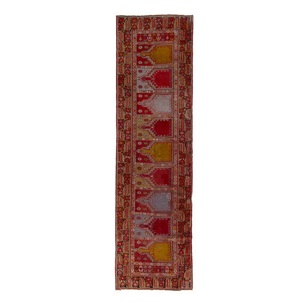 Stretching nearly 13 feet in length, this hand-knotted traditional wool runner is a masterpiece of color and craft, commanding attention with its rich, multicolored design. Anchored by deep, earthy reds and warm mustard yellows, the palette is elegantly punctuated by muted greys and whispers of light blue. It’s a symphony of shades that brings to life the intricate patterns that dance across its surface. The design unfolds through a series of repeated, mihrab-like arches, each a vignette of Anatolian history...