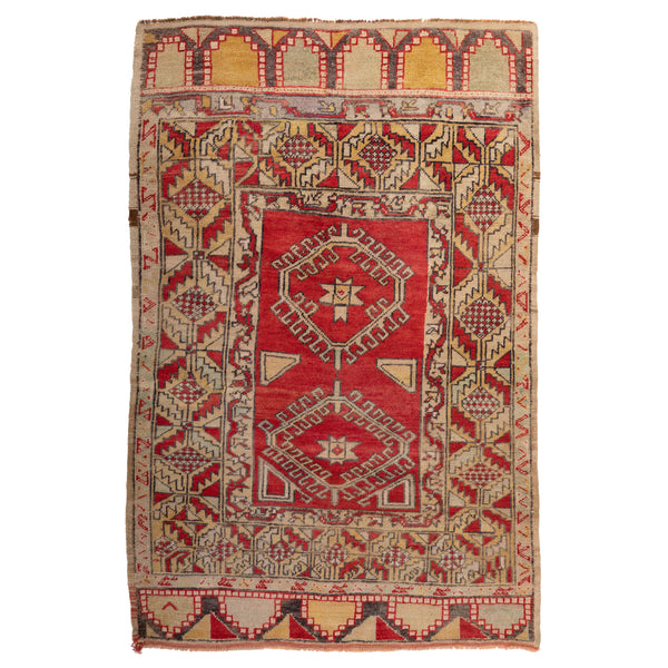 A burst of dazzling tradition unfurls in this hand-knotted Turkish wool rug. At 3'11" by 6'3", it's a testament to meticulous craftsmanship—a durable dance of form and function. Each knot speaks of the skillful interplay between age-old techniques and the unyielding strength of natural wool. The piled surface, a triumph of density, is both a solid stage for daily footsteps and a soft embrace for the soul. The rug commands attention with its bold centerpiece—a rich, earthy red field plays...
