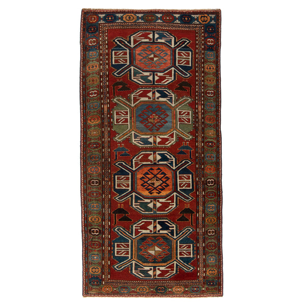 This hand-knotted wool rug, arriving from Russia, commands attention with its vibrant red field. Its dimensions, 4 feet 1 inch by 8 feet 5 inches, create a striking presence, marked by a series of vertically aligned geometric medallions. Each medallion tells its own story, weaving together rich blues, earthy greens, warm oranges, and gentle creams. The precision in these details speaks of an artistry honed over generations. Encased by a border that plays with contrasting geometric shapes and circular motifs,...