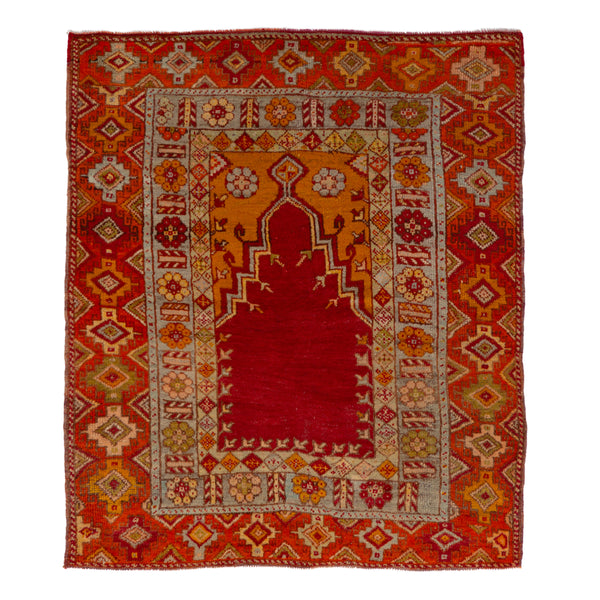 This hand-knotted wool rug from Turkey exudes traditional artistry and exceptional quality. Its dimensions—4 feet 3 inches by 4 feet 9 inches—blend versatility with presence, ideal for a cozy reading corner, an inviting entryway, or as a vivid accent in a bedroom. Dominating this piece is a striking red field, nurturing an environment that feels both warm and welcoming. At the heart of the design, an almost architectural motif in deep orange and golden yellow draws the eye, reminiscent of...