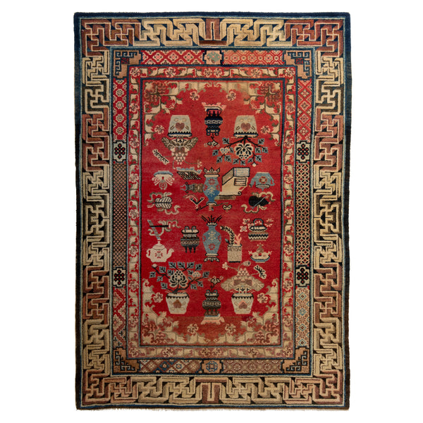 A Red Chinese Peking Rug, measuring an assertive 6'6" by 9'2", whispers of elegance and tradition. Its presence is a conversation between warmth and sophistication, artfully rendered in hand-knotted wool. Originating from China, this piece of craftsmanship tells a story of heritage through its deep rich red hue, a bold canvas upon which traditional Chinese motifs dance with grace and intention. Vases and teapots, symbols of virtue, unfurl in soft whispers of cream, light blue, and tender green, each highlighted...