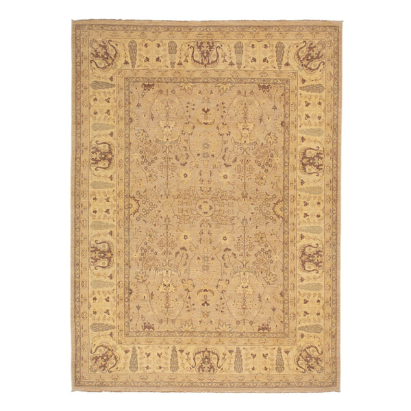 This beige wool rug transforms a room with its commanding presence and elegant understatement. At nearly 9 by 12 feet, its ample size redefines large living spaces, carving out cozy niches in living rooms, dining areas, or airy bedrooms. It's more than just a covering; it's the canvas on which furniture arrangements and daily life unfold. Crafted from robust wool, it handles the march of feet with grace. Wool's natural resilience stands up to life’s daily bustle, resisting the inevitable...