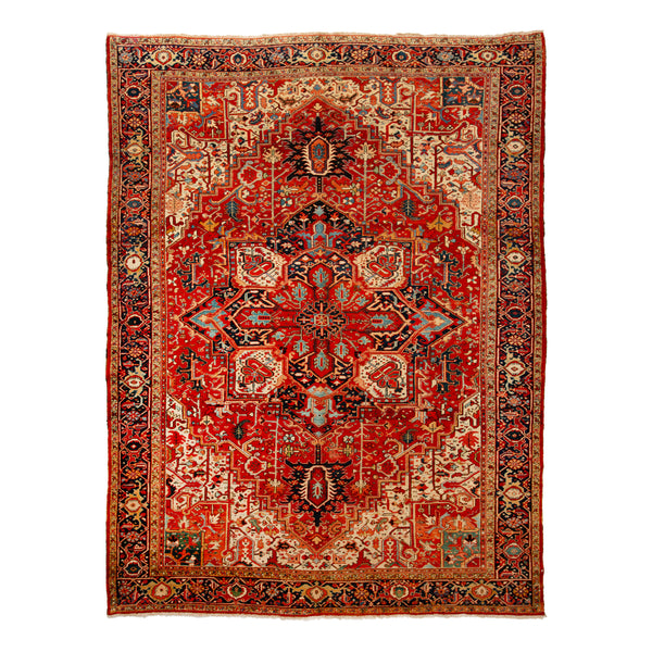 A Red Vintage Persian Heriz rug, at 9 feet 6 inches wide by 12 feet 11 inches long, transforms a space with its commanding presence. Hand-woven on the looms of India, the rug marries durable wool with a vibrant red hue, turning it into a canvas abuzz with the distinguished Heriz pattern. Its central medallion cuts an audacious figure with sharp geometric forms that engage in a dynamic dance with angular motifs. Surrounding this visual centerpiece is a tapestry of...