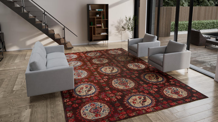 The voids between the grand medallions teem with intricate floral patterns, each small blossom adding to an overarching narrative that spans the rug’s expanse. This rug is an anchor, whether it graces a vast living room, a stately dining hall, or even a sprawling master suite. It's more than just decor; it transforms spaces by bringing in a tactile sense of history and luxury.
