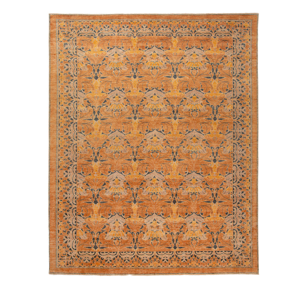 Meticulously hand-knotted in wool, this traditional 12'x15' rug features dramatic patterning in a regal and sunkissed palette of gold hues.