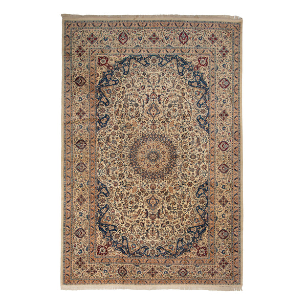 The expansive canvas of this hand-knotted wool rug from Iran unfolds like a carefully woven narrative, inviting you to linger beneath its arc of elegant design. At 13'2" x 19'5", it commands a space with presence and poise, promising warmth and durability, a gentle whisper of the artisans who have interlaced every knot. The lavish spread of floral motifs, joined by delicate vines and stylized palmettes, swirl across a cream and beige background. It's not merely decoration; it's an intricate...