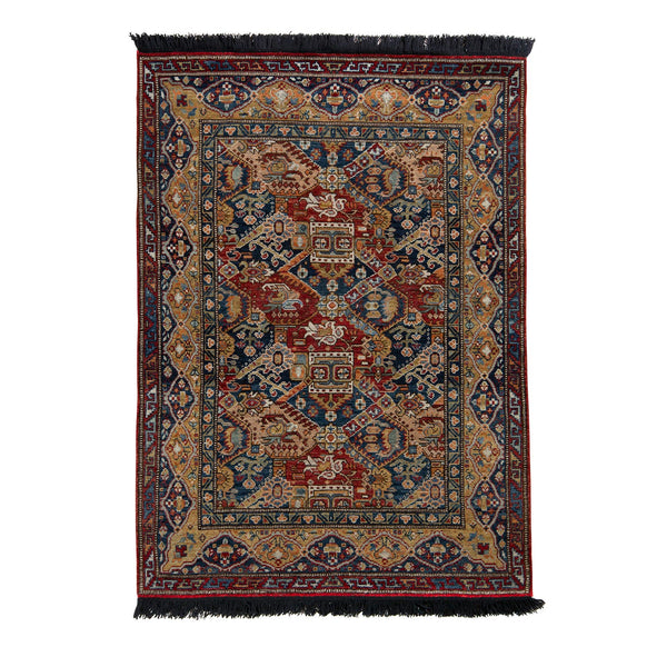 Crafted with stunning intricacy, the multicolored traditional wool rug from India speaks a language of artistry and necessity in your home. Its 5'1" x 7'3" frame does more than simply cover the floor; it redefines the ground it touches. Dominated by a rich palette—deep navy blues, warm reds, and golden ochre—it holds a visual dialogue between earth and sky. Light blue whispers and earthy brown murmurs meet cream accents, all woven into a medley of motifs that echo tradition with...
