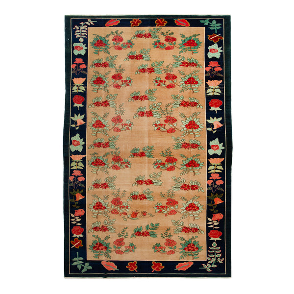 This Beige and Black Vintage Turkish Rug - 7'11" x 13' features an elegant floral motif that extends to a contrasting navy border filled with red and pink roses. Marrying historical style with modern artisanship & material, our collection of traditional rugs is filled with beloved patina for a rich timeworn texture. Each handmade rug is one-of-a-kind and reformed with respective care & attention.