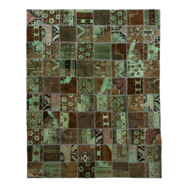 Deep pigments of green cast a meditative shade over the intricate traditional design of this hand-knotted Green Vintage Patchwork Wool Rug - 8' x 10'. Organically neutralized from its original color, this patchwork area rug was overdyed to produce a one-of-a-kind composition reborn through color.