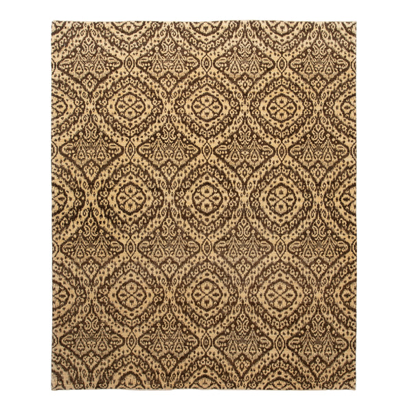 Elegance unfurls across this expansive wool rug, measuring 8 feet by 9 feet 5 inches, offering a foundation both substantial and striking. Its composition marries deep brown patterns with a sandy beige backdrop, creating a striking visual dynamic—an interplay of shadow and light that captivates. The design channels an ikat-inspired blend of ogee shapes and stylized medallions, merging organic forms with structured precision. The pattern’s distressed finish introduces character and depth, making it an ideal fit for interiors ranging from...