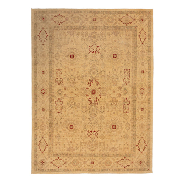 The Gold Traditional Wool Rug - 8'3" x 11'8" is a beautiful traditional rug from Pakistan. Hand-knotted from wool, it features intricate beige, red, and tan patterns with geometrical and floral designs. The symmetrical layout and elaborate motifs showcase the rug's elegance and craftsmanship, making it a timeless addition to any home decor.