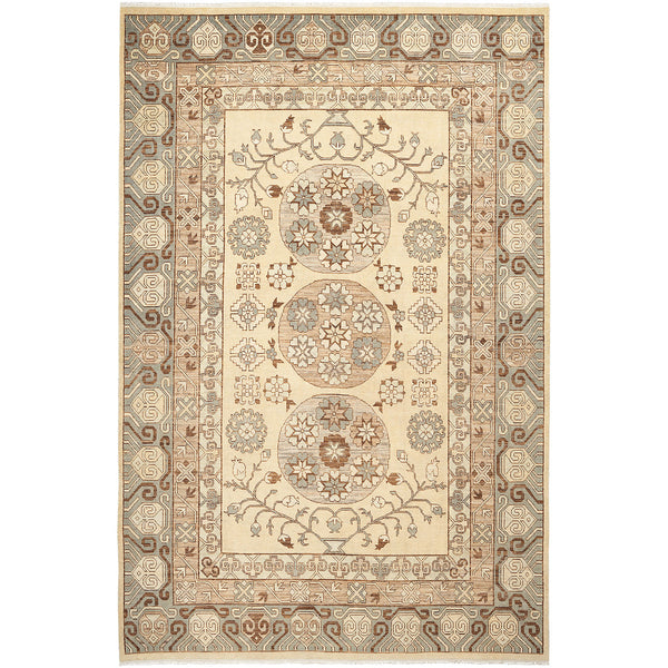 The Beige Traditional Wool Rug - 8'8" x 13'2" showcases a detailed design with a light beige background and three large medallions adorned with floral motifs and geometric shapes in shades of brown and taupe. Surrounding the medallions are additional floral elements, all framed by an ornate multi-layered border. Hand-knotted in Uzbekistan, this high-quality wool rug exudes classic elegance and timeless appeal.