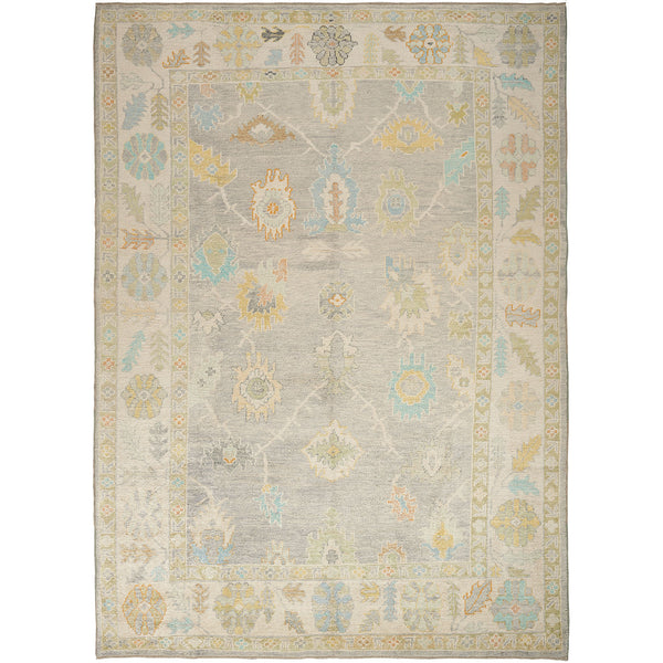 A hand-knotted wool rug, measuring a generous 8'9" by 12', instantly elevates any large space it graces. Its soft grey surface acts as an elegant backdrop, allowing intricate patterns in muted yellow, soft blue, teal, and subtle green to delicately emerge. These colors are reminiscent of classic motifs, harmoniously framed by a coordinating lighter border that adds a touch of sophistication. This rug doesn’t just drape a floor; it anchors a room. Whether in the living room, dining area, or...