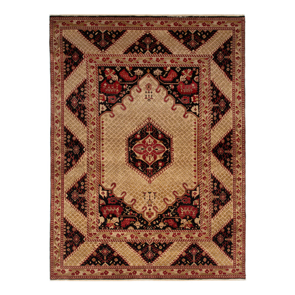 The 9' x 12' Multicolored Traditional Wool Rug transforms any room with its robust presence and artisanal charm. Its expanse of warm beige or tan serves as a plush canvas where deep, vivid reds, prominent blacks, and delicate accents of dark blue or brown converge. Anchoring this tapestry is a captivating central medallion in rich red and black, surrounded by a lively dance of geometric shapes and stylized floral motifs. Multiple borders layer these intense hues, framing the piece with...