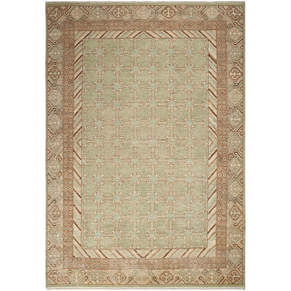 Beige Traditional Wool Rug - 9'1" x 14' from Uzbekistan. Hand knotted with intricate geometric patterns in shades of beige, tan, and brown. Made of high-quality wool, this traditional rug exudes elegance and sophistication. Perfect for adding a touch of luxury to any room.