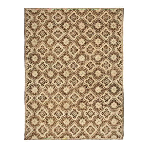 This hand-knotted wool rug, with its sprawling dimensions of 9'10" by 13'9", injects a room with a dose of history and grace. Originating from Pakistan, it’s a tapestry where each knot tells a story of the artisan's precision and passion. The traditional design isn’t just about function—it's a visual narrative laced with nuanced shades of beige and soft browns, forming a symphony of understated tones. The rug’s soul lies in its motifs: stylized quatrefoils that dance across its expanse, filled...