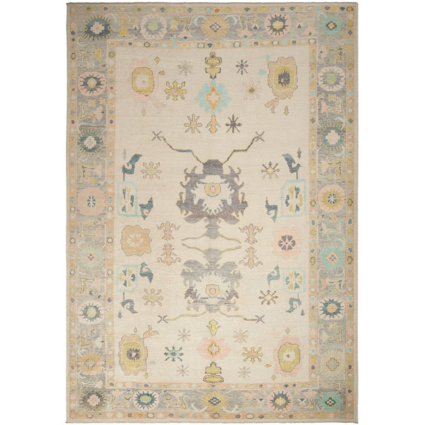 A stately presence defines the 9'9" x 14' beige wool rug, hand-knotted with the precision and artistry that Turkish craftsmanship is renowned for. The natural wool offers not just longevity and resilience, but also the kind of luxury that welcomes you in, quiet and assured. The background, a warm beige, sets a serene stage for its distinctive design narrative. At its edges, a distinct border unfurls, blending muted greys and sage greens with the soft playfulness of faded yellows, blues,...