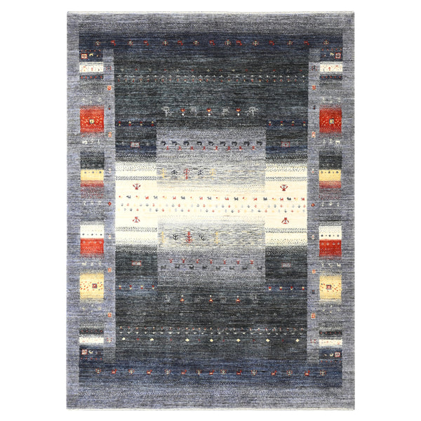 This Traditional Gabbeh Wool Rug features hand-knotted construction from India, crafted entirely from natural wool fibers. This construction provides a durable and soft foundation suitable for various interior settings. The rug presents a multi-tonal palette, primarily focused on brown and cream, with accent colors including muted red and orange. Its design showcases characteristic Gabbeh styling through an abstract, geometric pattern. A central cream-colored field contains scattered, minimalist motifs, framed by broader bands displaying mixed brown and grey striations. Vertical sections...