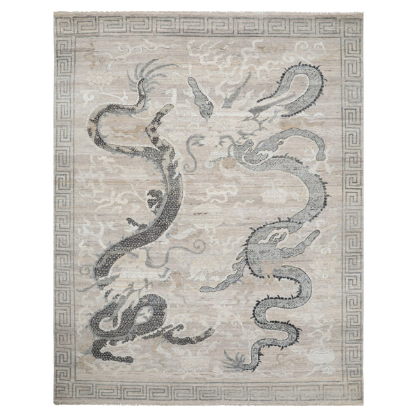 This Grey Dragon Transitional Wool Rug - 8' x 10' is hand-knotted by rug artisans in India to honor traditional dragon motifs in a modern color palette of blue, taupe, brown, grey, and black. Finished with an intricate key border and textured fringe, this double dragon area rug showcases the true art form of artisan rug making.Transitional rugs are a beautiful foundation for your home with a mix of contemporary tones and traditional designs. Meticulously created by hand, these one-of-a-kind...