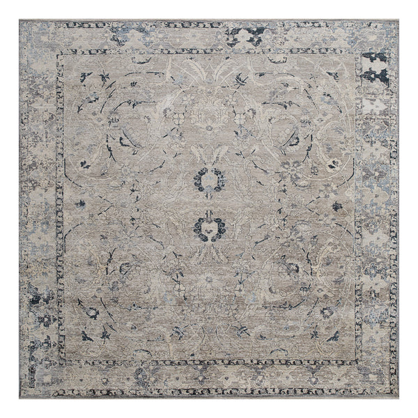 Elegance takes form in this Grey Transitional Silk Linen Blend Rug, an exquisite addition that transforms any living area into a haven of style. Hand-knotted with precision in India, this 8' x 9'9" rug marries durability with a refined aesthetic, revealing a nuanced palette of warm gray and beige, accentuated by whispers of charcoal, dark gray, and muted blue. Such complexity in color weave creates a tapestry rich with depth, allowing it to subtly command attention without overpowering the space....