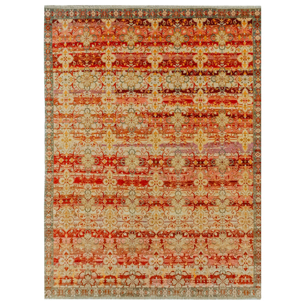 Hand-knotted by expert artisans with delicate yet durable silk, this Orange Transitional Wool Rug - 8' x 10' is a true work of art with its combination of old-world techniques and new modern style. A contemporary color palette of red, orange, and pink shifts as you walk around the room and discover new viewpoints to enjoy this overlayed floral design. Finished with a textured fringe. Hand-knotted by expert artisans with delicate yet durable silk, this Transitional Hand-Knotted Area Rug -...