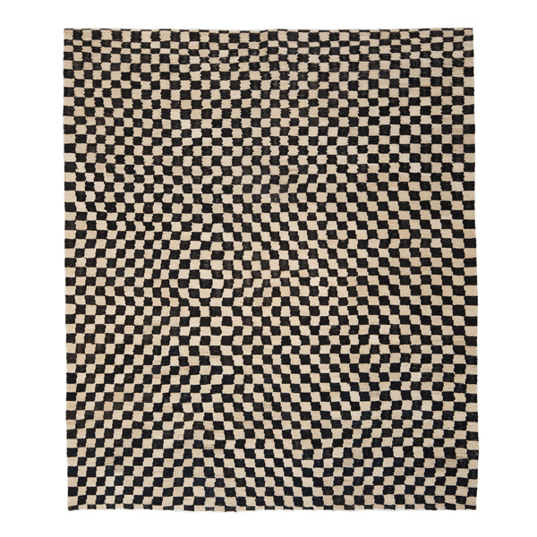 This Black & White Transitional Kilim Wool rug features a striking black and white checkered pattern that creates a unique visual illusion of wavy squares. Hand Knotted in Central Asia, this 6'5" x 5'10" rug boasts a three-dimensional texture and is made of high-quality wool for a luxurious feel.