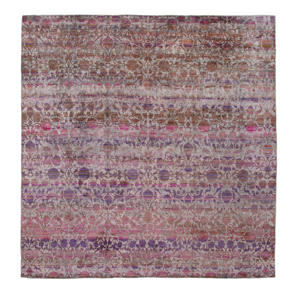 This Pink and Purple Transitional Silk Linen Blend Rug measuring 16' x 16'4" is a breathtaking piece that showcases the artistry of Indian craftsmanship. Hand-knotted with intricate patterns, it features a harmonious blend of shades including purple, pink, beige, and brown, creating a captivating banded look that adds depth and character to any room. The luxurious combination of silk and linen not only enhances its aesthetic appeal but also ensures a soft, sumptuous texture underfoot.Perfect for both traditional and contemporary...