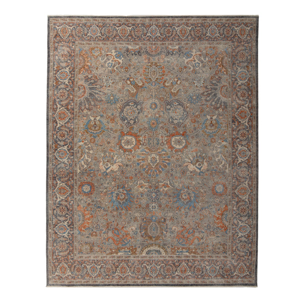 This hand-knotted traditional wool rug, measuring 8' x 10', originates from India. It features a Sabideh pattern with a distressed finish, offering an aged aesthetic. The primary color is greige, complemented by a complex design that integrates muted blues, oranges, and cream tones, along with darker outlines in the border, contributing to its intricate appearance. The design showcases a classic central medallion layout, surrounded by detailed floral motifs and organic patterns that extend across the field. The distressed treatment gives...