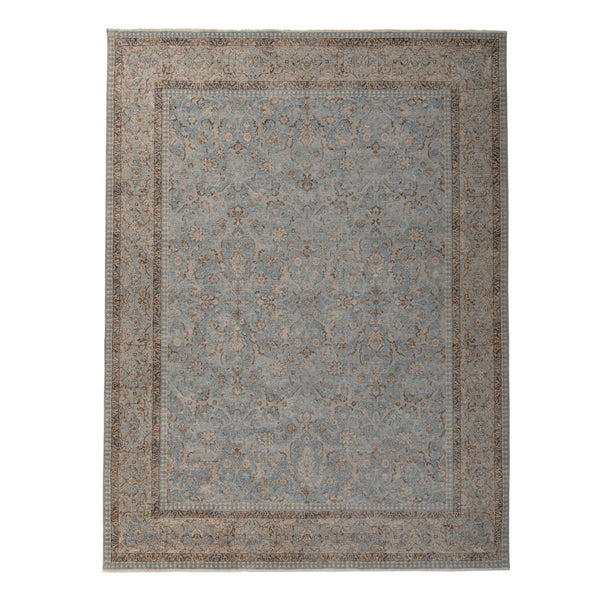 This Sabideh traditional rug, measuring 9 feet by 12 feet, offers a classic foundation for various interior spaces. Hand-knotted from wool in India, this area rug showcases detailed craftsmanship and durable construction. The design features an all-over traditional pattern with floral and vine motifs. A muted blue tone, consistent with a Frost shade, dominates the central field, while intricate patterns and the layered border are rendered in complementary shades of brown and beige. This color combination provides a sophisticated, understated...