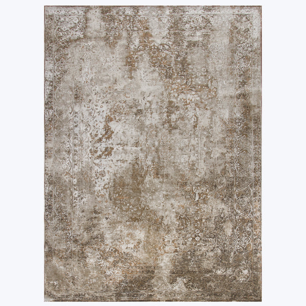 The Brown Transitional Wool Silk Blend Rug - 9' x 12'7" is a hand-knotted masterpiece from India. Featuring shades of beige and brown in a vintage floral motif, this high-quality rug exudes rustic charm. The intricate design and luxurious texture make it a perfect addition to any shabby chic interior.