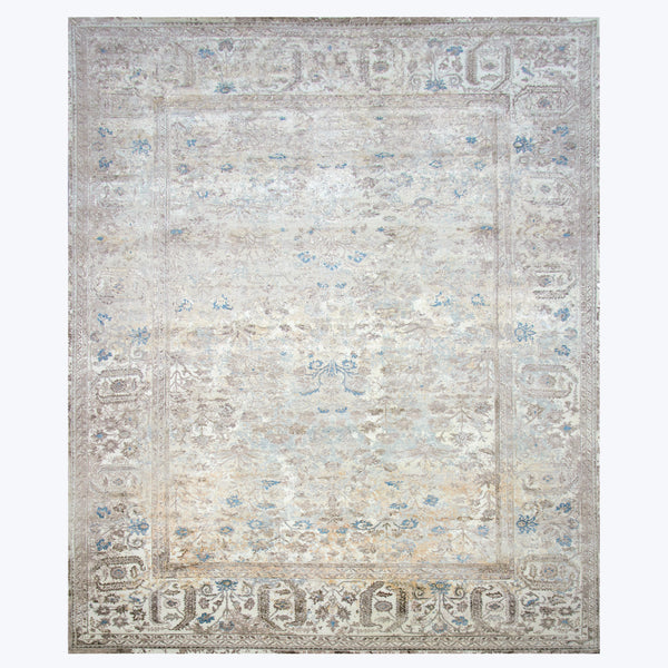 Elevate your space with the Beige Traditional Wool Silk Blend Rug. Hand-knotted in India, this 9'3" x 12'3" traditional rug features a muted color palette of beige, cream, and soft blue with intricate floral and geometric patterns. The high-quality wool silk blend offers a luxurious texture that will add sophistication to any room.
