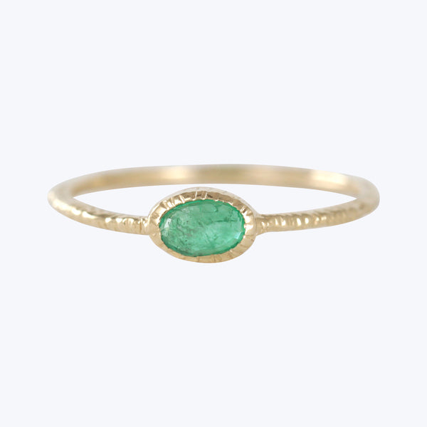 Add artisanal beauty to your look with the Treasure Ring, Emerald by Danielle Welmond. Cast in beautifully hammered 14K gold, this delicate band features a striking 3 x 5 mm oval emerald. Wear it solo for an understated feel, or stacked with other gold bands for a more substantial look. The Treasure Ring, Emerald is lovingly handcrafted in Los Angeles.