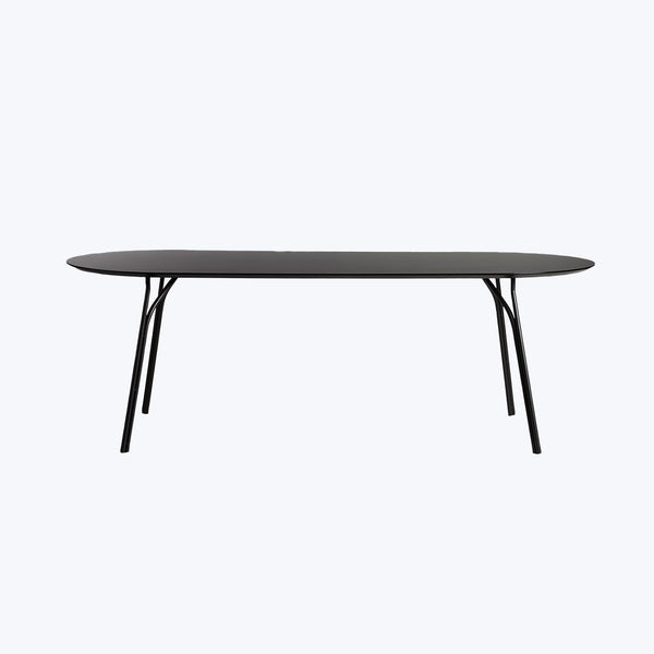 The Tree Dining Table, designed by Elisabeth Hertzfeld, showcases metallic legs in a variety of colorways for a sleek, graphic look in your dining room. Ramifying like the branches of a tree, this long oval dining table's legs are crafted from two steel tubes that rise side by side before their paths separate to support the tabletop in several places. WOUD is FSC Certified ensuring that products are crafted in a responsible and sustainable manner.
