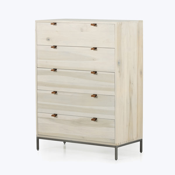 Inspired by clean mid-century design, the Trey 5 Drawer Dresser is crafted from light-washed solid poplar wood and offers plenty of bedroom storage space with its five spacious drawers. The metal-secured top-grain leather pulls add a textural element of surprise. The natural iron and dove poplar colors give this bedroom dresser a fresh and modern look that is made to complement a variety of bedroom and guest room decor.