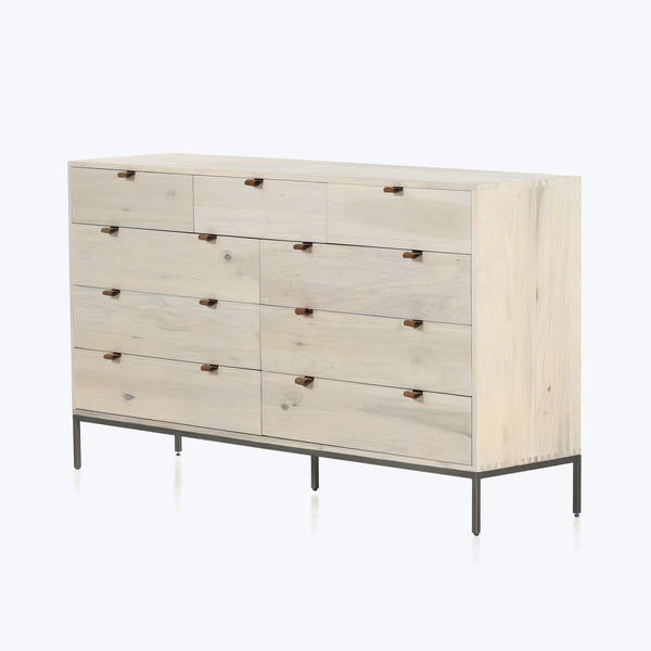 The Four Hands Trey 9-Drawer Dresser is a masterful blend of mid-century design and modern sophistication, expertly crafted from light-washed solid poplar wood. With its clean lines and minimalist form, this dresser measures 70" L x 18" D x 39.5" H, offering generous storage with nine spacious drawers. Each drawer is enhanced by metal-secured top-grain leather pulls, adding a tactile contrast that elevates the overall design.The dresserÕs refined off-white hue, complemented by the natural iron accents, exudes a timeless elegance,...