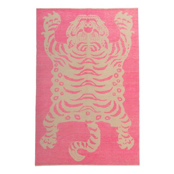 This Pink Contemporary Tiger Wool Rug is a 6'9" x 10'1" masterpiece from Turkey. Hand Knotted with luxurious wool, this rug features a symmetrical depiction of a tiger in abstract, curvilinear patterns on a vivid pink background. The off-white details provide a striking contrast, making it a modern interpretation of a classic symbol. Add a touch of sophistication to your home with this high-quality, stylish Contemporary rug.