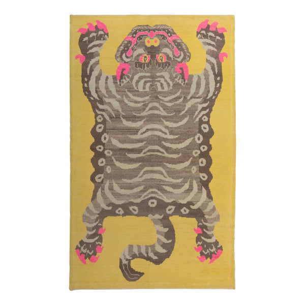 This contemporary wool rug features a striking tiger design set against a vibrant yellow background. Hand-knotted in Turkey, this piece measures 6 feet 8 inches by 10 feet 6 inches, offering a substantial size for various living spaces. The rug's central motif showcases a stylized tiger in shades of dark brown and light gray, dynamically posed with its front paws raised. Pink accents define the tiger's claws on all four paws, as well as detailing around the eyes, nose, and...