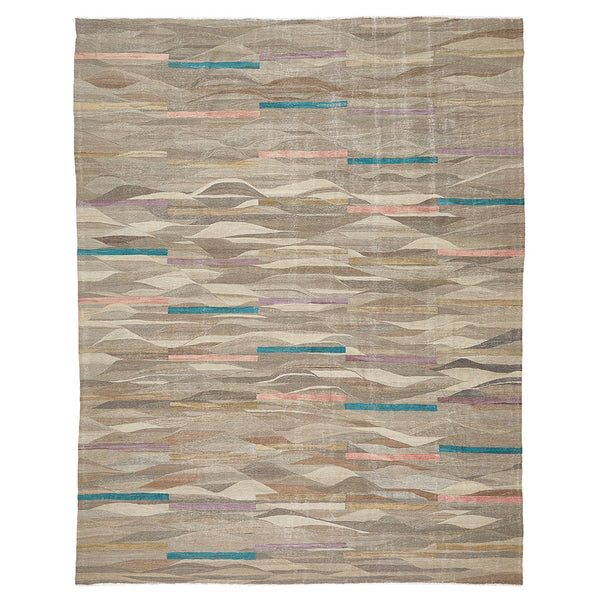 An 11'6" by 14'9" Turkish flatweave wool rug stands as a canvas where traditional craftsmanship meets contemporary art. Its hand-woven allure speaks of hands skilled in age-old techniques, yet the design whispers modernity with every inch. Earthy greys, taupes, browns, and beiges flow like gentle rivers across the surface, interrupted—no, enlivened—by jolts of vibrant color: teal that’s like a bold promise, soft pink that dares to be tender, lilac with its quiet charm, and a yellow that whispers sunshine. Crafted...