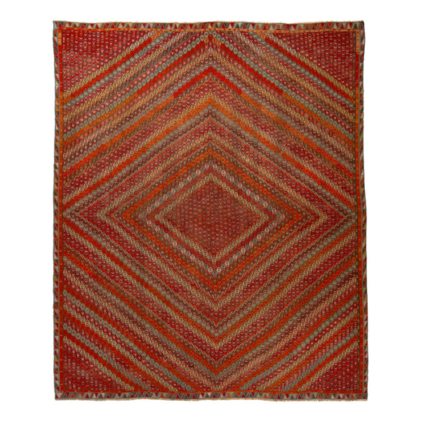 A bold statement lies at the heart of a room with this Red Turkish Flatweave Wool Rug, measuring a commanding 14 feet 11 inches wide by 17 feet 5 inches long. It anchors the space with an impressive blend of artistry and practicality. Hand-woven in Turkey, this kilim provides more than just a decorative foundation; it is an embodiment of durability, well-suited for bustling household environments. The rug's charm lies in its concentric diamond pattern, which unfolds outward in a...